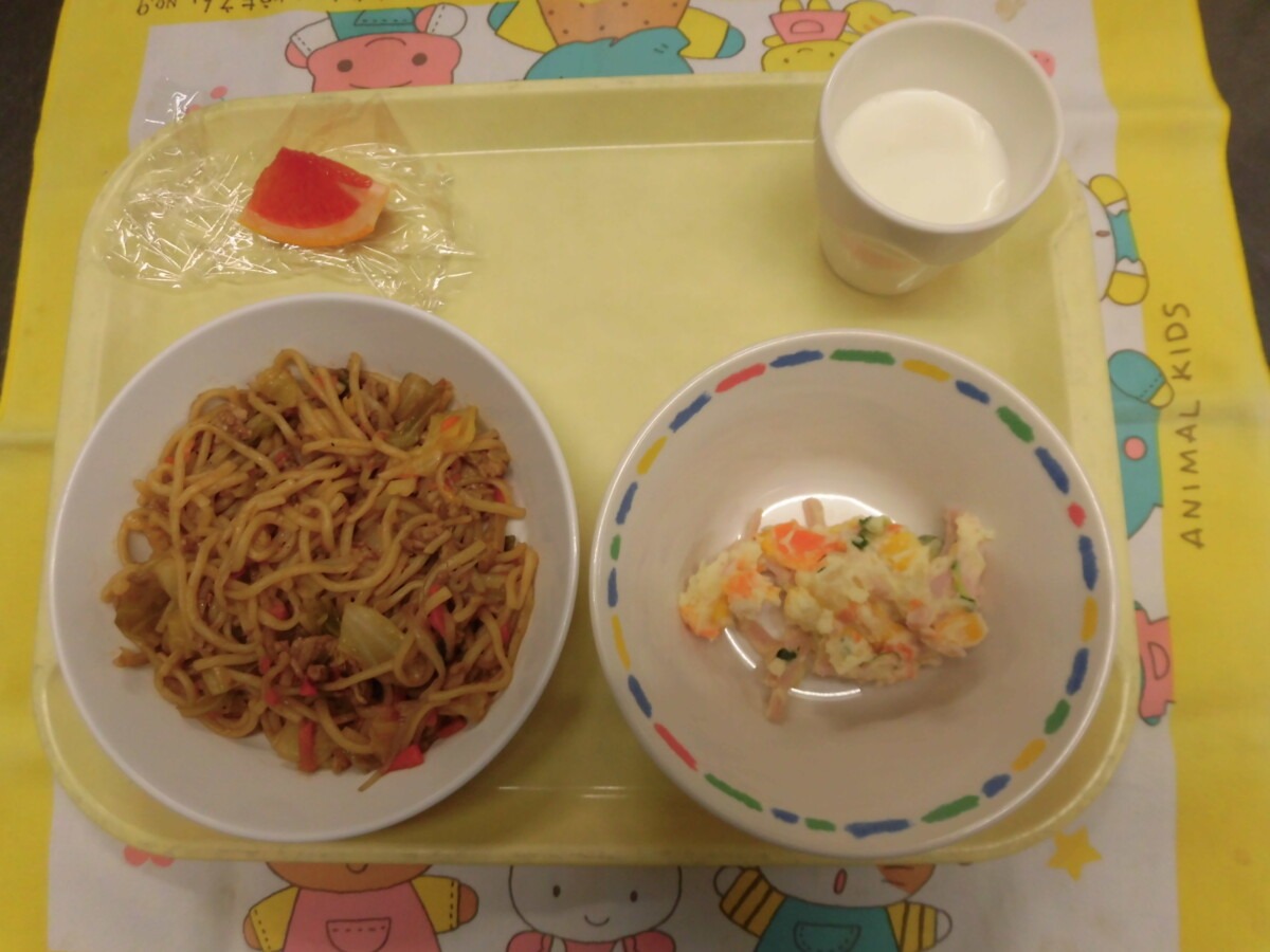 焼きそばは、キャベツ・たまねぎ・人参・もやしをたくさん入れました。ポテトサラダは、年長さんリクエストの一つです。たくさん食べてくれました。