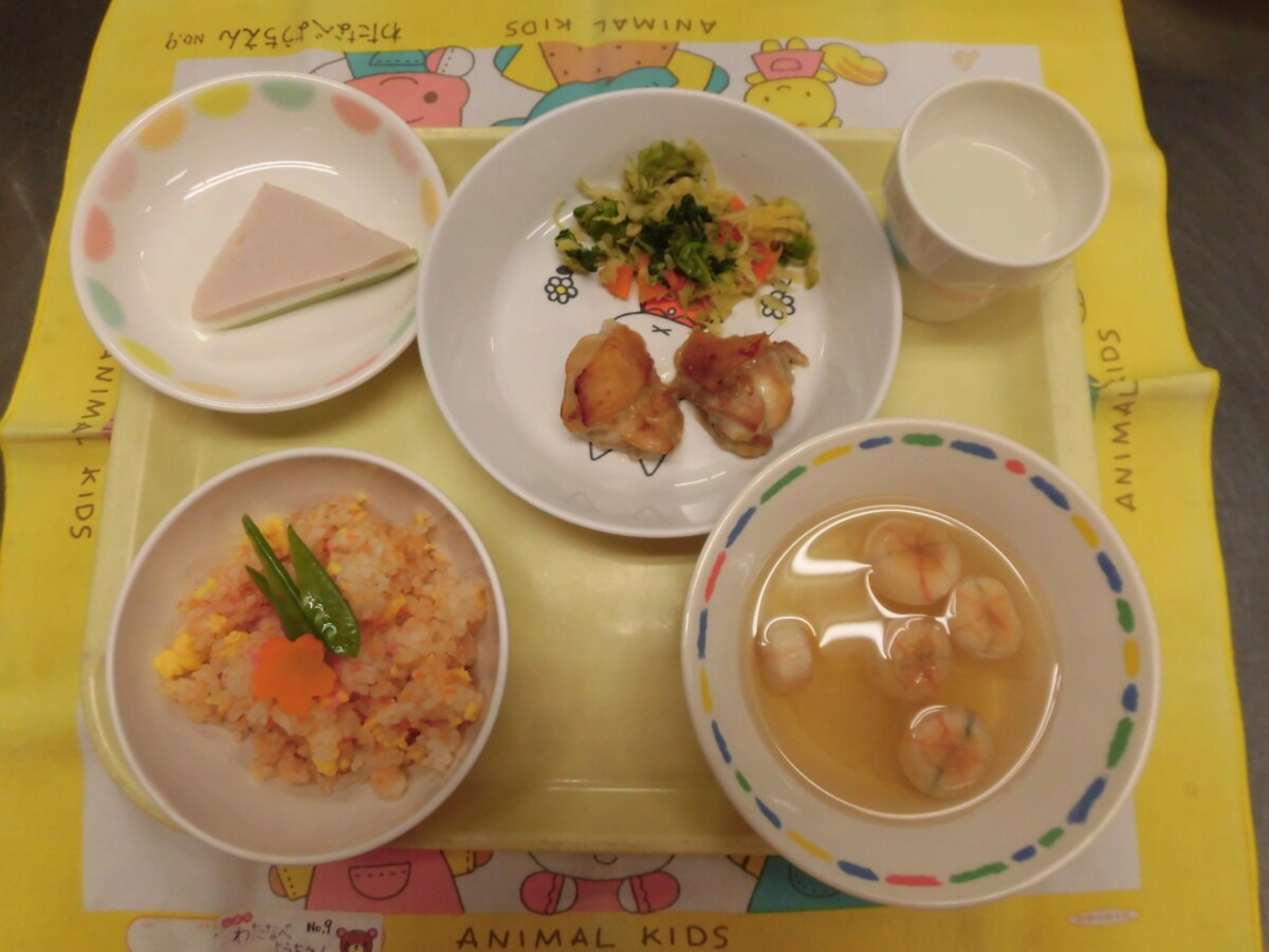 3月3日(火)彩ご飯・鶏肉の照り焼き・菜の花のお浸し・てまり麩のお吸い物・カルピス・三食ゼリー