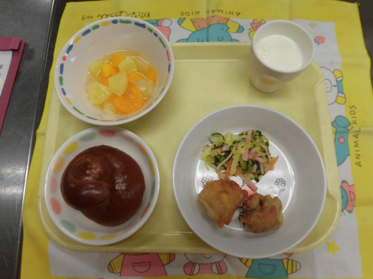 3月5日(木)黒糖ぱん・鶏肉の唐揚げ・ハムサラダ・牛乳・フルーツポンチ