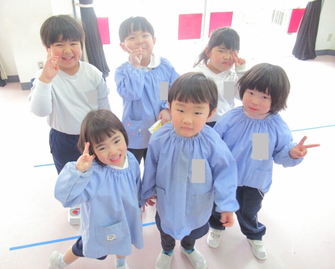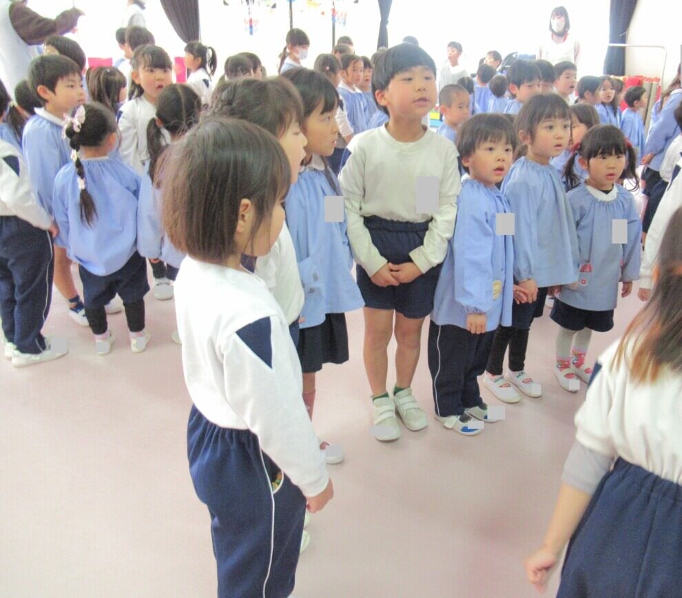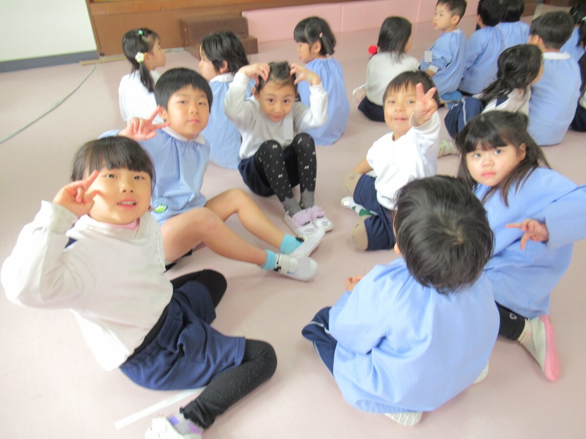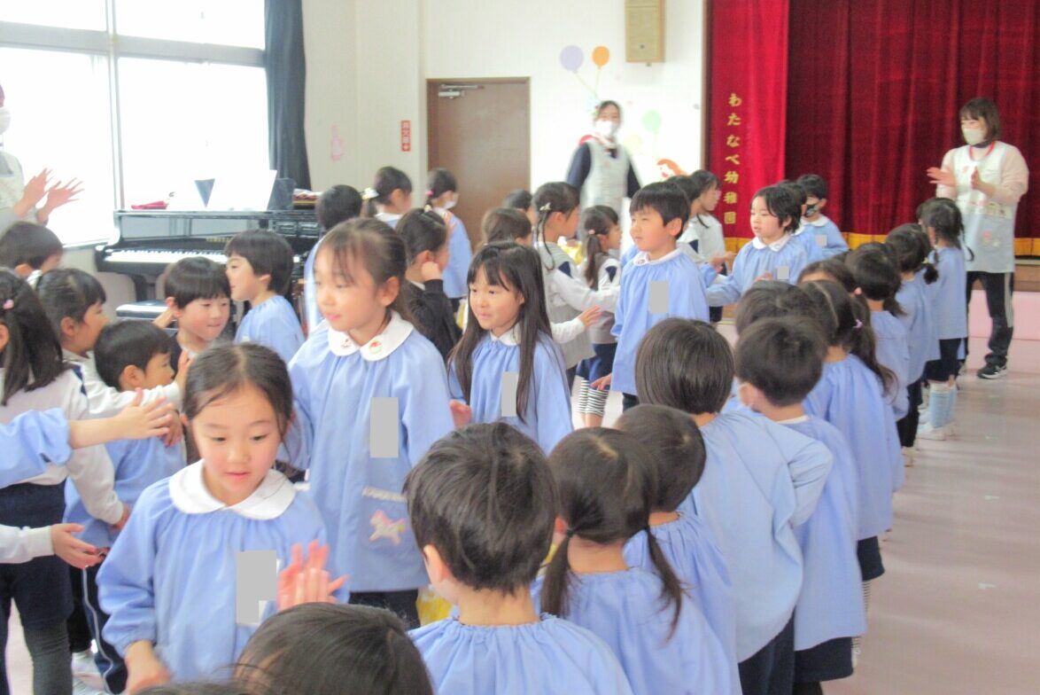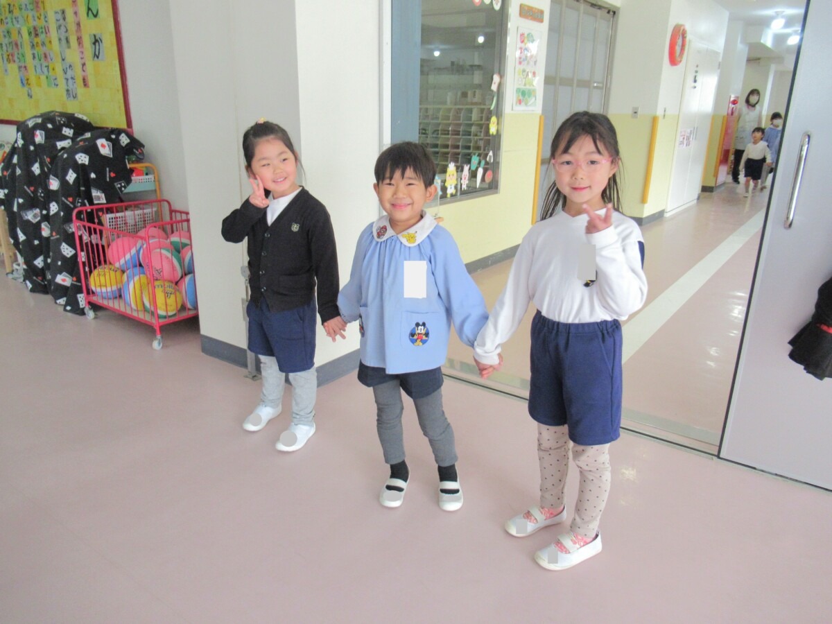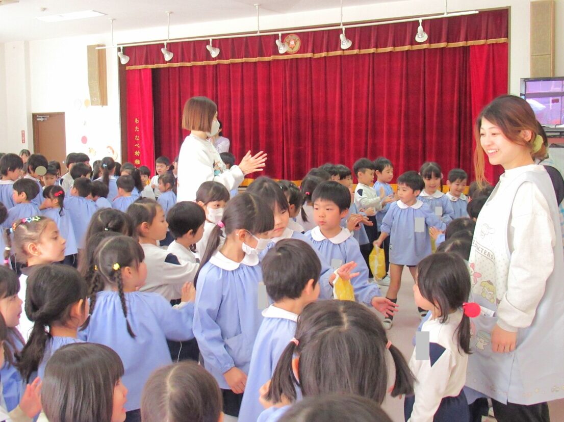 ☆ホールで年少組さんもバディの年中組さん、年長組さんと手をつなぎ、お別れ会を楽しみました🎵