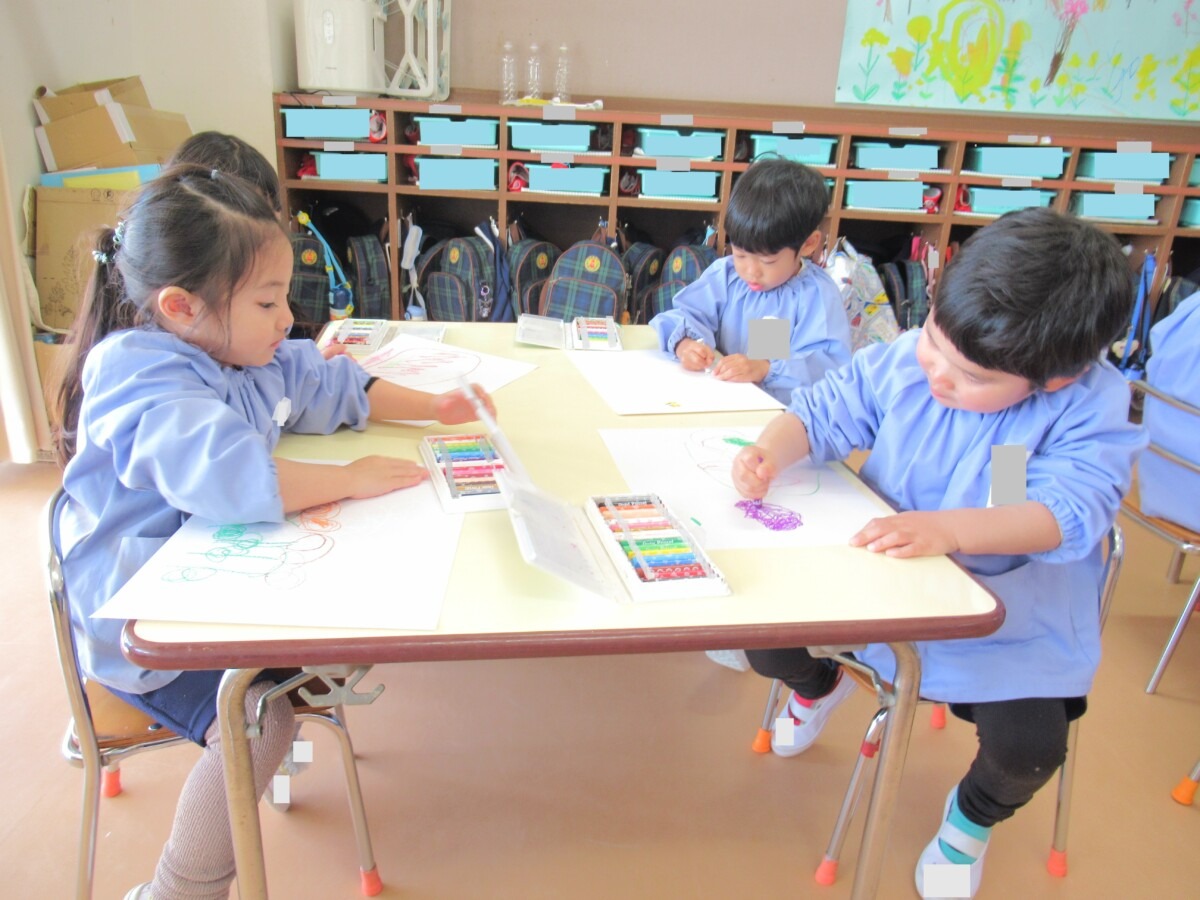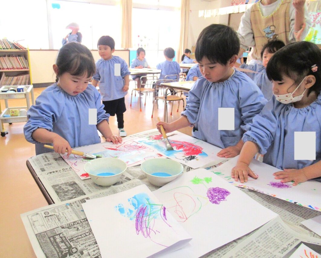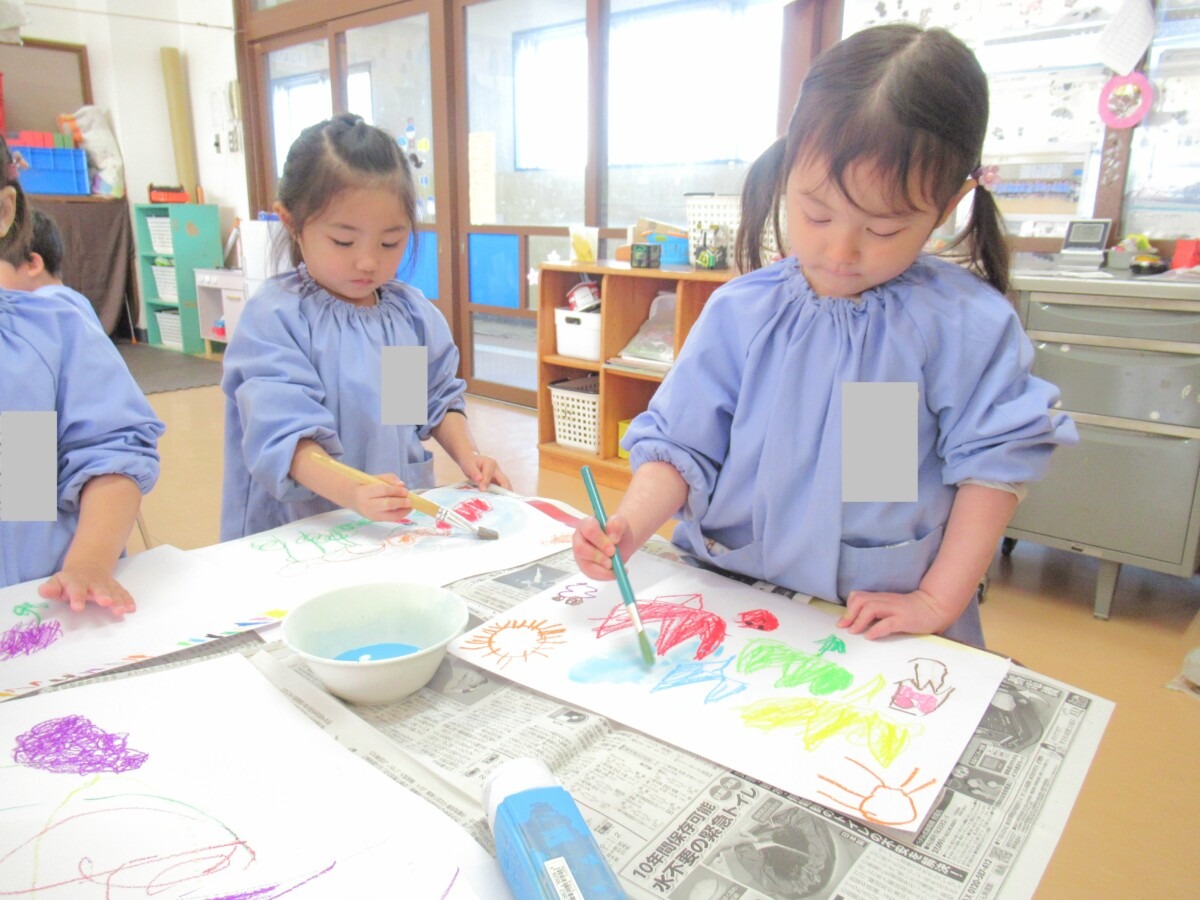 ☆ひよこ1組さんが、クレヨンで画用紙にチューリップなどの春の絵を描き、絵を描いたところの上から絵の具を塗って、”はじき絵”を楽しんでいました🎵