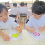 ☆ひよこ3組さんが、運動会のお遊戯の衣装に貼る”雲”と”雨粒”と”星”の色塗りに …